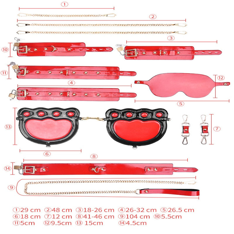 | Dimension | Length: Chains Ankle Cuff to Ankle Cuff - 11.42 inches (29 cm) Handcuff to Ankle Cuff - 18.9 inches (48 cm) Handcuffs - 7.09-10.24 inches (18-26 cm) Ankle Cuffs - 10.24-12.6 inches (26-32 cm) Blindfold - 10.43 inches (26.5 cm) Knee Pads - 7.09 inches (18 cm) Hooks - 4.72 inches (12 cm) Collar - 16.14-18.11 inches (41-46 cm) Leash - 40.94 inches (104 cm) |